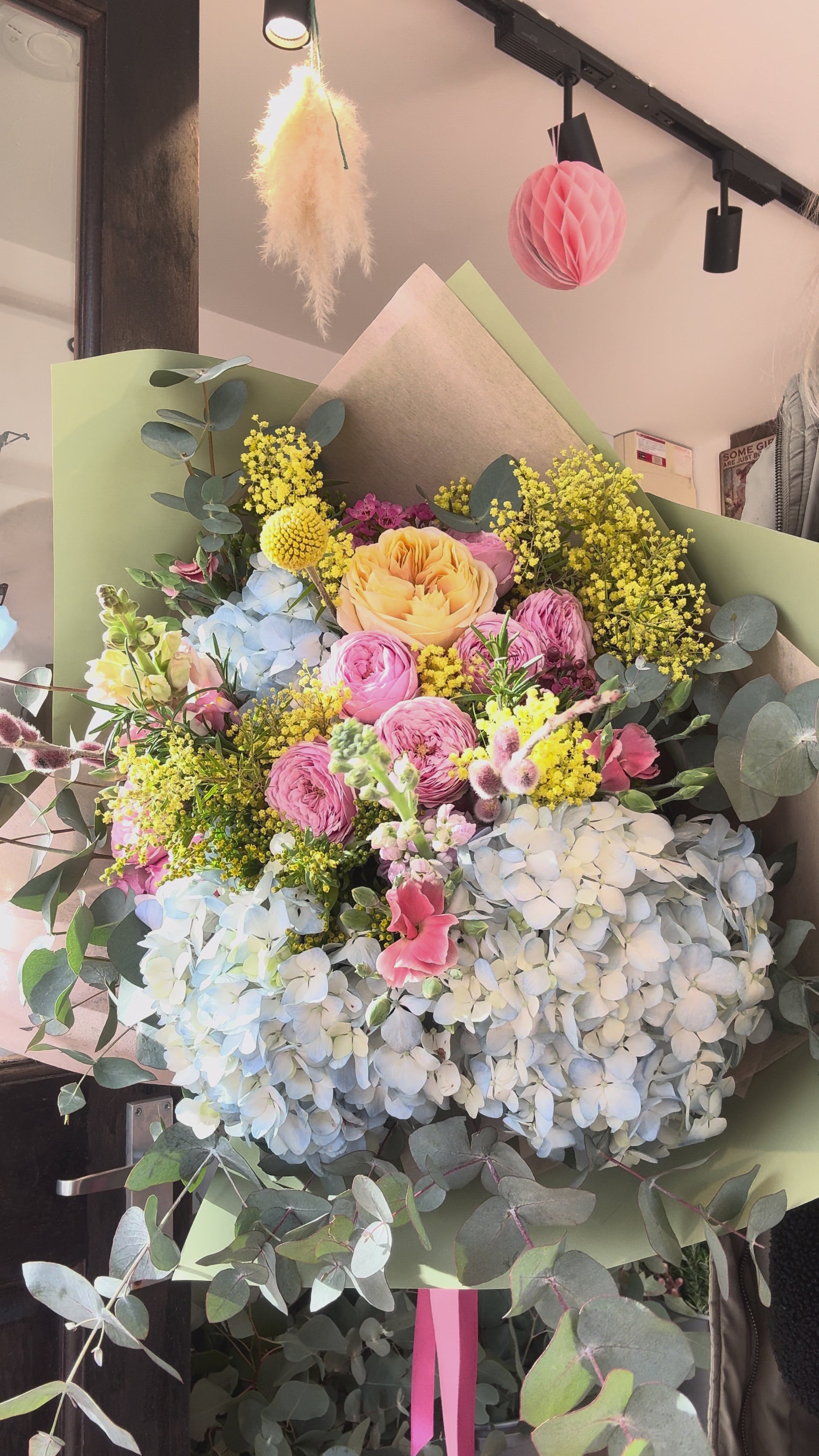This bouquet features a refined mix of seasonal flowers and foliage. Blooms may include roses, hydrangea, stocks, wax flower, chrysanthemums, acacia, achillea, eucalyptus, and other complementary seasonal stems.